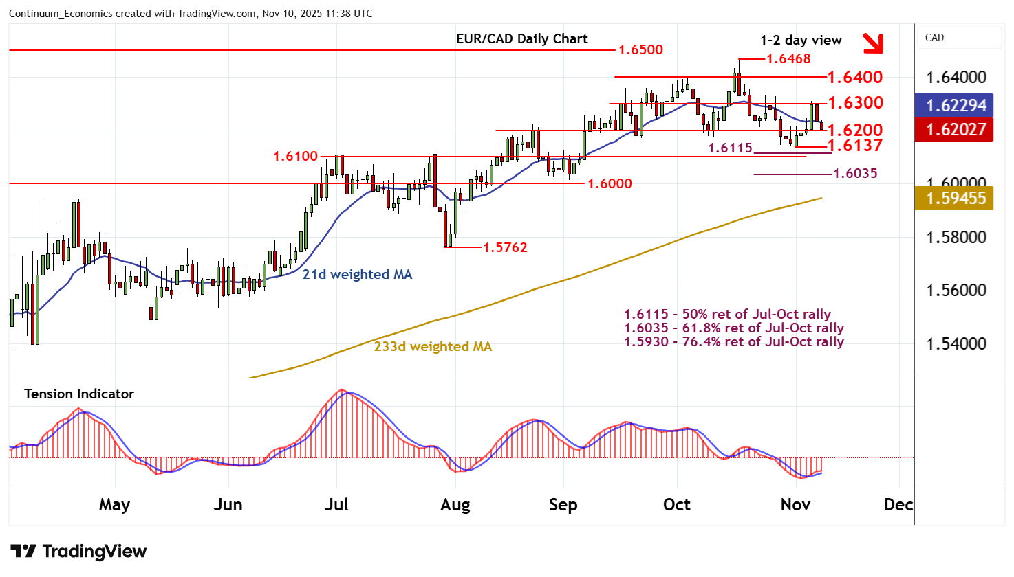 11:20 GMT - The anticipated test of congestion resistance at 1.6300 has met selling interest, with prices falling steadily to congestion support at 1.6200. Rising daily readings are flattening, suggesting a minor deterioration in sentiment and room for further losses in the coming sessions. A break will open up strong support within 1.6100/15 - 1.6135~. However, oversold weekly stochastics are flattening, suggesting any initial tests could give way to consolidation, before bearish longer-term readings prompt further losses. A close beneath here will add weight to sentiment and extend mid-October losses towards the 1.6035 Fibonacci retracement. Meanwhile, resistance remains at 1.6300 and should cap any immediate tests higher.
