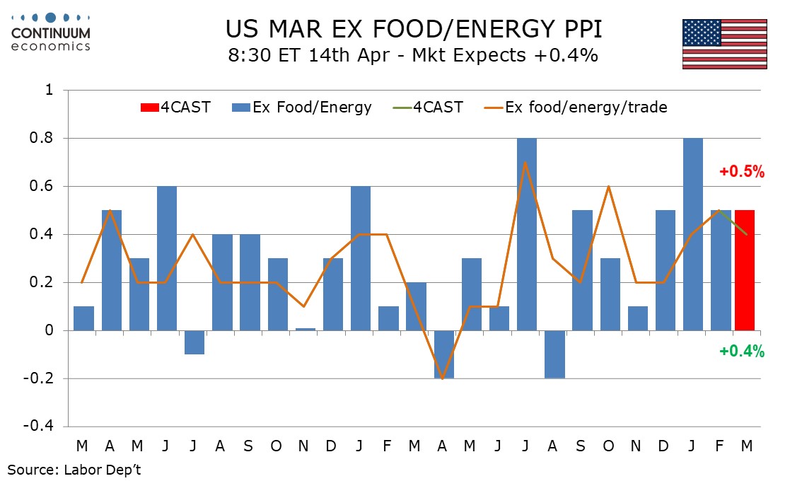 We expect PPI to rise by 1.0% in March, which would be the strongest rise since March 2022. The rise will be led by energy, though the core rates ex food and energy at 0.5% and ex food, energy and trade at 0.4% are likely to maintain a recent acceleration.