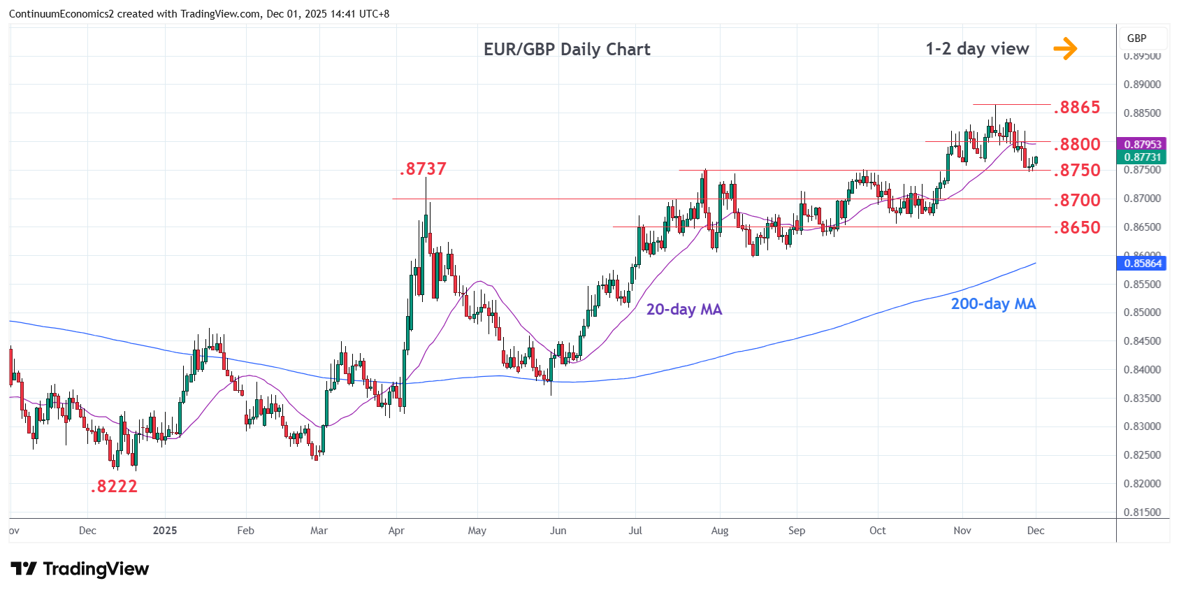 Turned up from test of the .8750/.8737 support as prices consolidate losses from the .8865, November YTD high