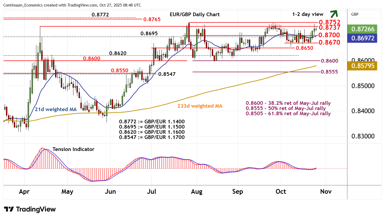 08:40 GMT - The anticipated test of critical resistance at the 0.8737 monthly high of 11 April and the 0.8752 current year high of 28 July has been pushed back from 0.8745, as intraday studies turn down, with prices currently balanced around 0.8725. Rising daily stochastics and the positive daily Tension Indicator highlight room for a retest. But mixed weekly charts should limit any initial tests in renewed consolidation. A close above here, however, will turn sentiment positive and extend December 2024 gains initially towards 0.8765/72. Meanwhile, support remains at 0.8695/00 and extends to the 0.8670 recent range lows. This range should underpin any immediate setbacks.