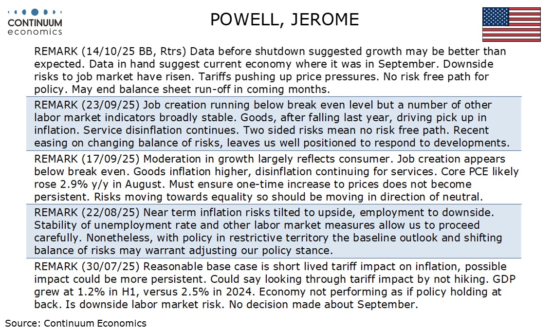 On balance we still expect a 25bps easing in December, but our central view is that data will resume in mid-November and will not show a clear increase in inflationary risks or a fresh acceleration in the labor market. Our Q3 GDP estimate of 2.3% is also lower than several, if stronger than the first half. Still, the caution towards December suggests that a pause in Q1 2026 would be likely to follow a December move. The comments on December’s meeting ensured that the decision to end Quantitative Tightening on December 1 was not given excessive attention. Powell had signaled that this was likely in comments on October 14.