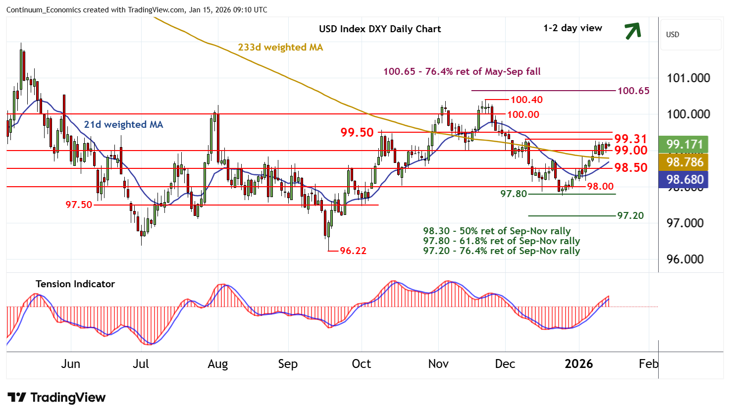 08:55 GMT - The anticipated test below congestion support at 99.00 has bounced from 98.95~, with prices currently trading around 99.15. Overbought daily stochastics have ticked higher and the daily Tension Indicator continues to rise, highlighting room for a test of strong resistance at the 99.26/31 weekly highs from 9 December - 9 January. A tick higher in weekly stochastics points to room for a break above here towards 99.50. But the flat weekly Tension Indicator and negative longer-term charts should limit any further strength in renewed selling interest towards 100.00. Meanwhile, support remains at 99.00. A close beneath here would help to stabilise price action and give way to consolidation above further congestion around 98.50.