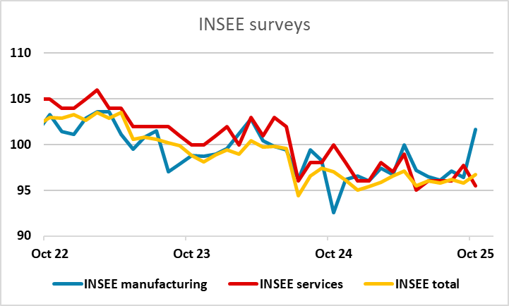 The French INSEE survey has shown a strong improvement in manufacturing in October, although the general business situation remains relatively weak. There has been a slight EUR recovery in reaction to the data, and the better manufacturing tone should be seen as mildly supportive given the recent wobbles due to concerns about the French fiscal and political situation. However, the data looks a little out of line with other surveys, and with services and the total business situation still in the doldrums, an extended reaction should not be expected.