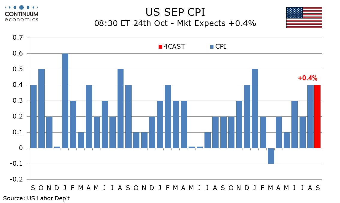 We expect a 0.4% increase overall in September CPI with a 0.3% rise ex food and energy, matching August’s outcomes after rounding, though before rounding we expect overall CPI to be rounded down from 0.425%, and the core rate to be rounded up from 0.28%, contrasting August data when headline CPI was rounded up from 0.38% and the core rate was only marginally below 0.35% before rounding.