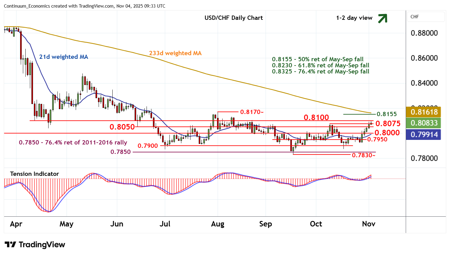 09:20 GMT - The test of resistance at the 0.8075 weekly high of 9 October has given way to a break towards 0.8100, where deteriorating intraday studies and flat overbought daily stochastics are prompting a pullback to 0.8075. The daily Tension Indicator continues to rise and broader weekly charts are positive, highlighting room for further strength in the coming sessions A close above 0.8075 will improve sentiment and extend mid-September gains beyond 0.8100 towards strong resistance within the 0.8155 Fibonacci retracement and the 0.8170~ monthly range high of 1 August. But already overbought daily stochastics should limit any initial tests of this range in consolidation. Meanwhile, a close back below 0.8050 will turn sentiment neutral and prompt consolidation above congestion support around 0.8000.