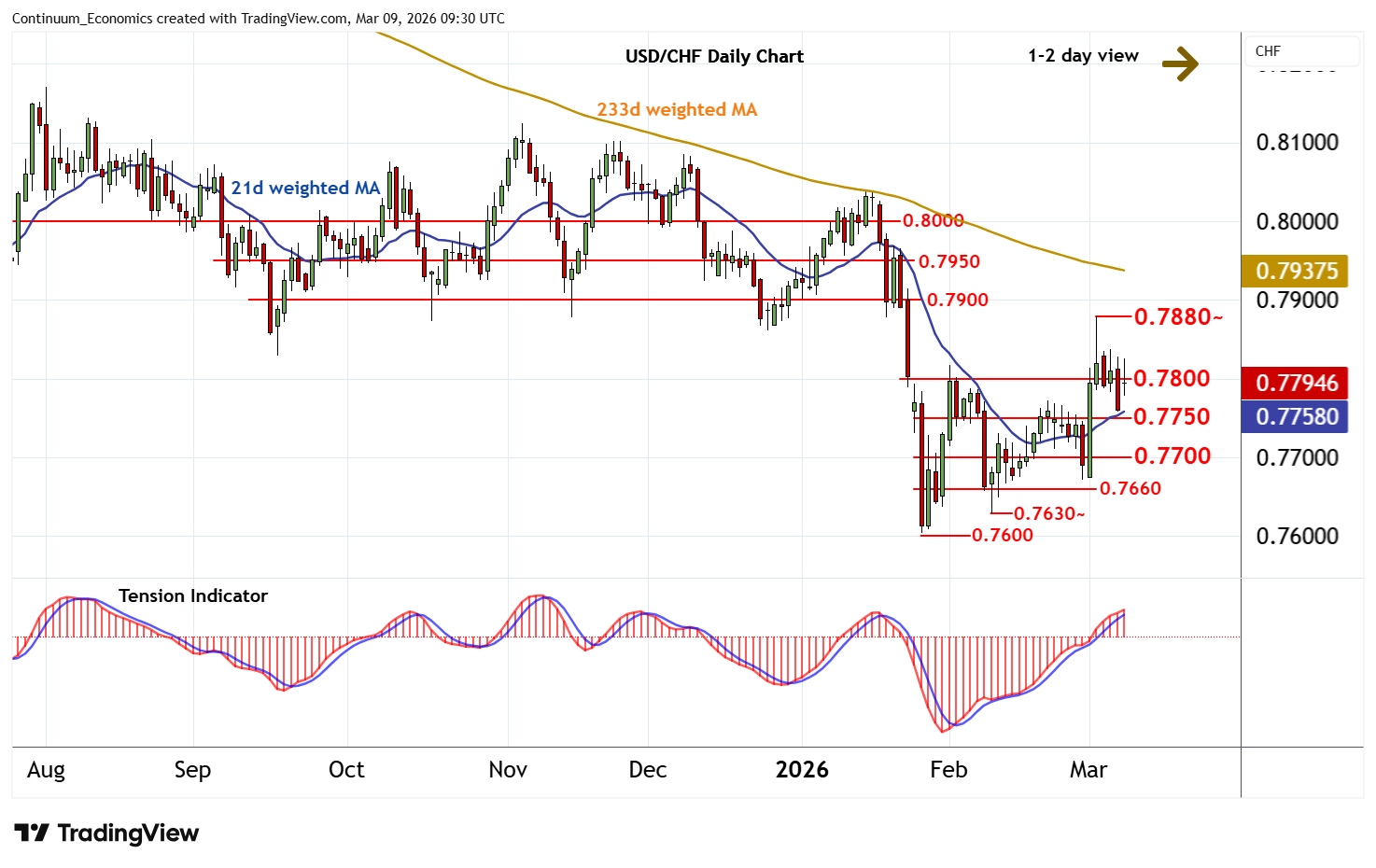 09:25 GMT - Little change, as mixed intraday studies keep near-term sentiment cautious and extend consolidation around 0.7800. Overbought daily stochastics are unwinding, highlighting room for a test beneath here. But the positive daily Tension Indicator and rising weekly charts should limit scope in renewed buying interest above congestion support at 0.7750. Following cautious trade, fresh gains are looked for. But a close above the 0.7880~ high of 3 March is needed to turn sentiment positive and confirm continuation of late-January gains.