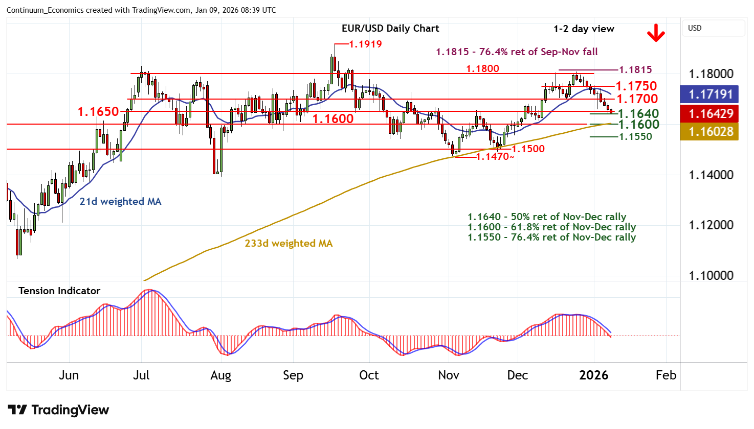 08:30 GMT - Anticipated losses have reached support at congestion around 1.1650 and the 1.1640 retracement. However, daily stochastics and the daily Tension Indicator contine to track lower and broader weekly charts are coming under pressure, highlighting room for further losses. A break will add weight to already bearish price action and extend December losses towards stronger support at 1.1600. However, already oversold daily stochastics are expected to limit any initial tests in consolidation. Meanwhile, resistance remains at congestion around 1.1700. A close above here, if seen, would help to stabilise price action and prompt consolidation beneath further congestion around 1.1750.