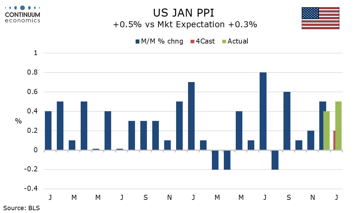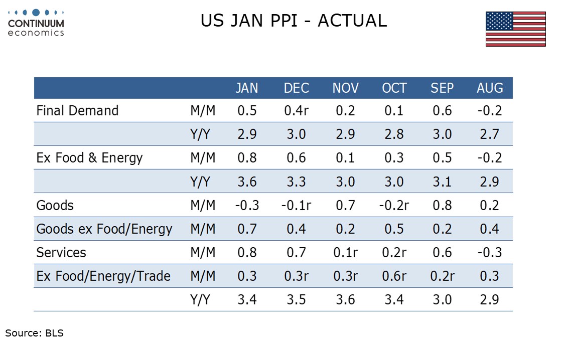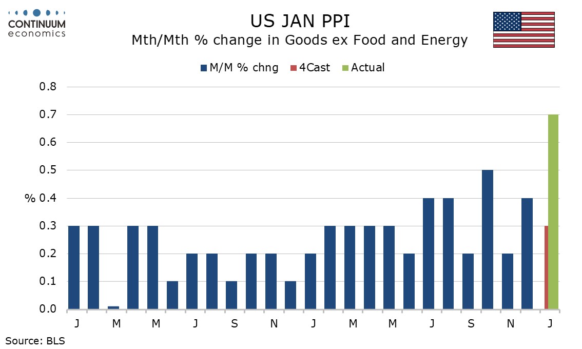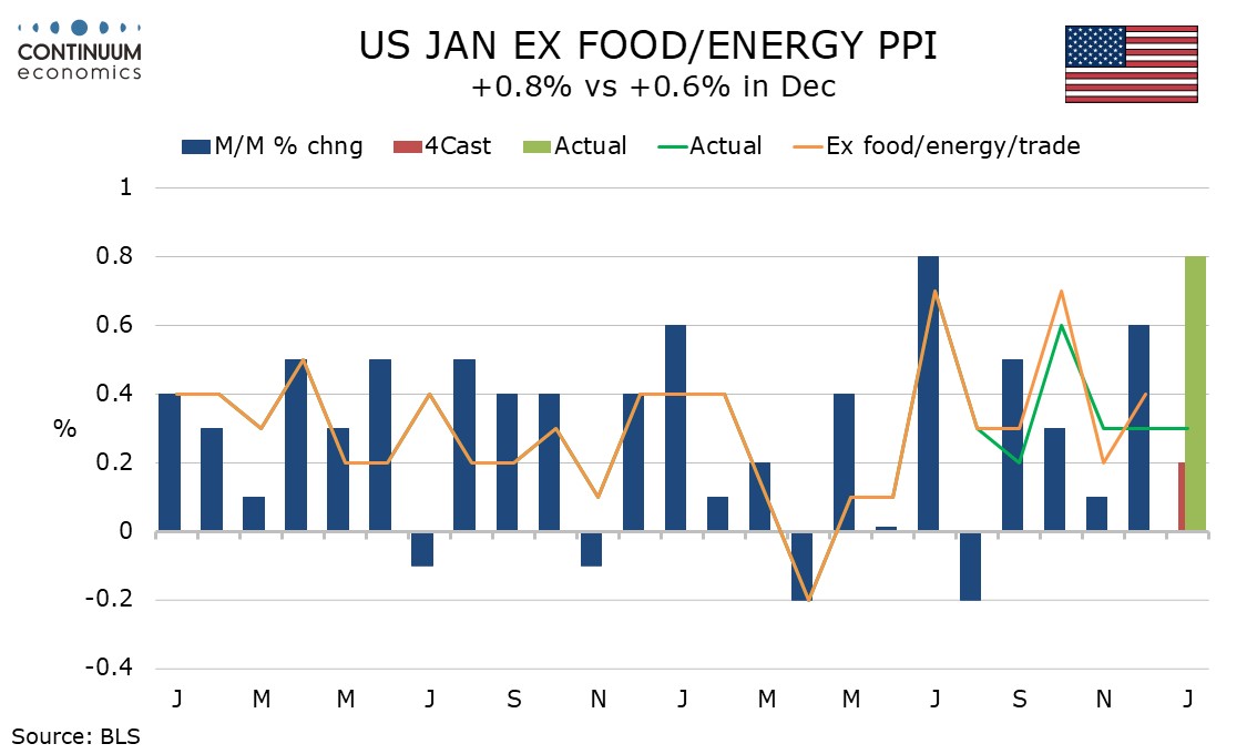 January PPI has made a strong start to 2026, with a stronger than expected 0.5% increase overall and an even stronger 0.8% increase ex food and energy, both following December gains that were almost as strong. Ex food energy and trade the picture is less alarming, up 0.3% for a third straight month, but even this is consistent with above target inflation persisting.