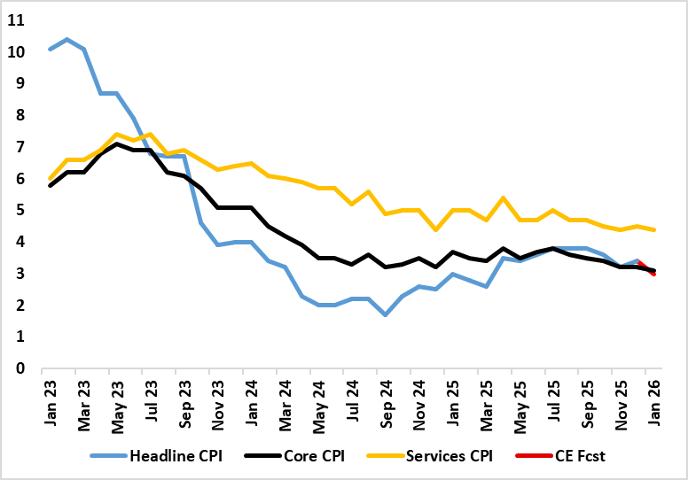 Although most aspects of the January CPI came in a notch above BoE thinking, the clear fall in the headline rate and further looser labor market messages still point to a BoE rate cut next month, not least given the likely return to the 2% target by April. These projected falls started with these January numbers (Figure 1) where airfare distortions which pushed up the December outcome unwind, and where base effects helped reduce food inflation – albeit where PPI numbers also point to softer such price pressures. As a result, the headline CPI rate fell from December’s 3.4% to 3.0% (a 10-mth low). Services and the core rate fell both 0.1 ppt to 4.4% ad a new cycle low of 3.1% for the latter. Notably such declines have been signalled for some time by adjusted m/m data (Figure 2), with already-soft wage figures likely to result in lower underlying inflation ahead (Figure 3).