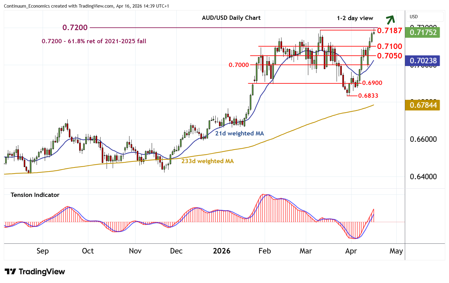 14:30 BST - The anticipated test of critical resistance at the 0.7187 monthly high of 11 March and the 0.7200 long-term Fibonacci retracement is giving way consolidation, as intraday studies turn down and overbought daily stochastics unwind. The daily Tension Indicator continues to rise, however, and weekly stochastics are rising, pointing to room for further gains in the coming sessions. A close above the 0.7200 Fibonacci retracement would turn sentiment positive and confirm continuation of April 2025 gains, as focus then turns to the 0.7280~ high of June 2022. Meanwhile, support remains down to congestion around 0.7100. A close beneath here, if seen, will help to stabilise price action and prompt consolidation above further congestion around 0.7050.
