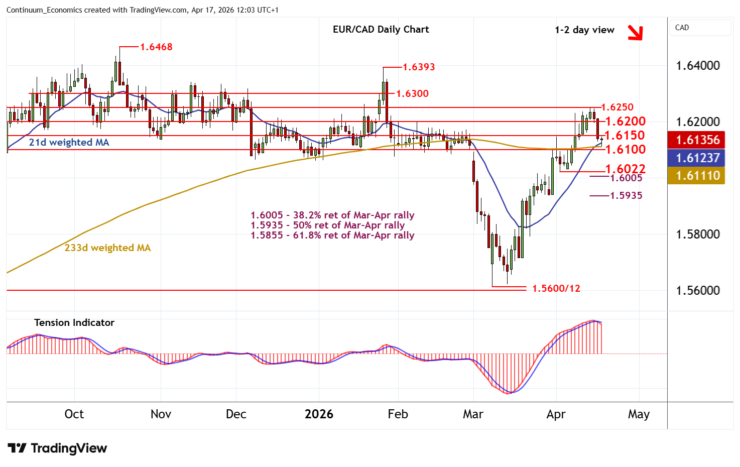 11:50 BST - Anticipated losses have bounced from above support at 1.6100, as oversold intraday studies flatten, with prices currently trading around 1.6135. Daily stochastics are bearish and the daily Tension Indicator is also turning down, highlighting room for further losses in the coming sessions. A break below 1.6100 will add weight to sentiment and open up the 1.6022/25 lows from 2-6 April. But rising weekly charts should limit any deeper losses in consolidation above 1.6000/05. Meanwhile, a close back above congestion resistance at 1.6150 should give way to consolidation beneath further congestion around 1.6200.