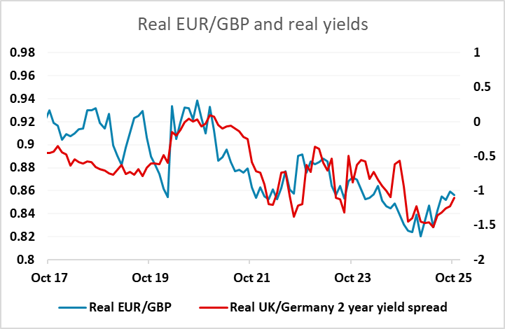 UK PMI also slightly better than expected, allowing EUR/GBP to fall back after the rise following the stronger than expected German and Eurozone PMI. We are a little sceptical that the German number is genuine, but even if it is, the fact that the German index rose and the French index fell is potentially a bigger issue than the rise in the Eurozone composite index, as most of the concerns around the EUR relate to the problems in France. The UK PMI data is as a rule a less reliable contemporaneous indicator for the UK than the Eurozone indicator is for the Eurozone, so the modest rise is of limited GBP significance. We still doubt that EUR/GBP can make a proper test of the 0.8763 high of the year, as we still regard a November 6 UK rate cut as unlikely.