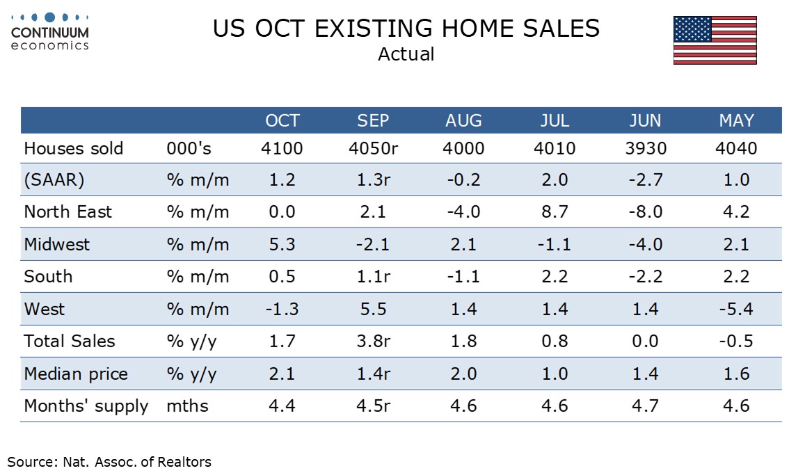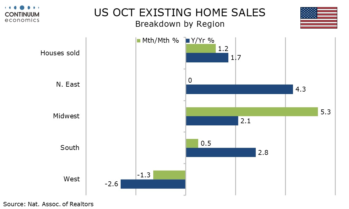 A 1.2% rise in October existing home sales is in line with other private sector surveys (NAHB, MBA and pending home sales) suggesting some revival in the housing market as the Fed resumes easing. With the scale of future easing uncertain the housing sector outlook is too.