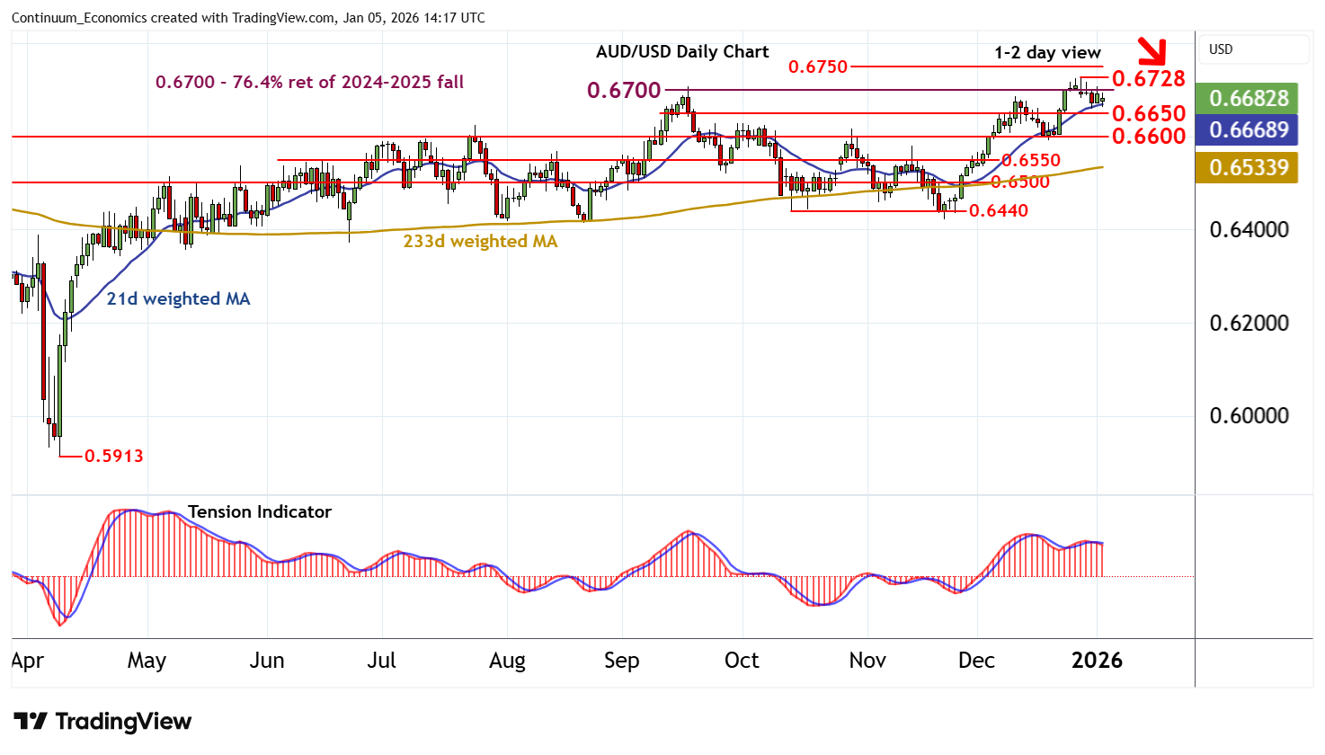 14:15 GMT - Still little change, as mixed intraday studies keep near-term sentiment cautious and extend consolidation beneath strong resistance at the 0.6700 Fibonacci retracement. Deteriorating daily readings highlight room for a test lower towards congestion support at 0.6650. However, rising weekly charts should limit any deeper losses in renewed buying interest/consolidation above congestion around 0.6600. Following cautious/corrective trade, fresh gains are looked for. A close back above 0.6700 will improve sentiment and extend April gains beyond the 0.6728 year high of 29 December 2025 towards congestion around 0.6750. Beyond here is 0.6800.