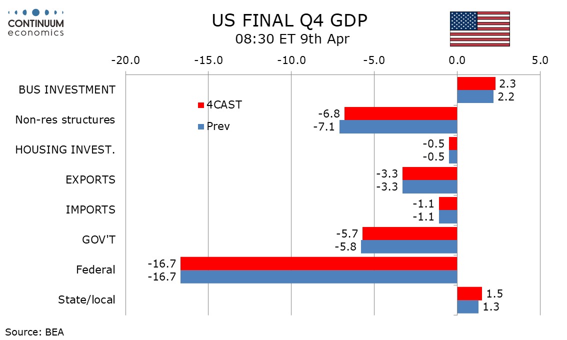 We expect the final estimate of Q4 GDP to see no significant revisions, with marginal upward revisions to construction insufficient to lift the annualized gain from the preliminary 0.7%.
