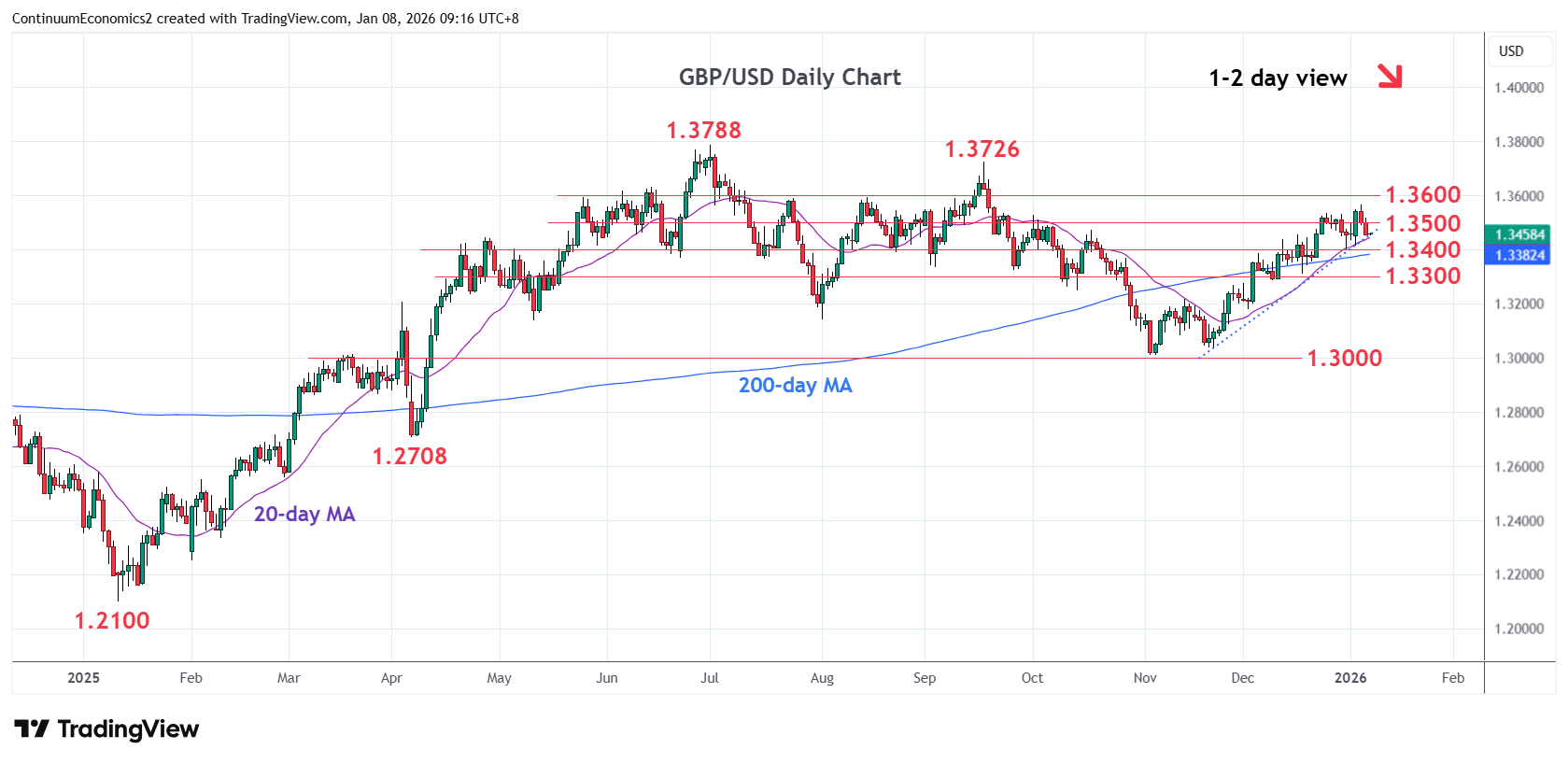 01:25 GMT - Settled back in consolidation from the 1.3568 high as prices unwind overbought intraday and daily studies. Break of support at the 1.3450/1.3400 area will open up room for deeper pullback to retrace rally from the 1.3010, November low. Lower will open up room to strong support at the 1.3300 level. Corrective pullback is expected to give way to renewed buying interest later with resistsnce now lowered to the 1.3500 level. Above here will expose the 1.3568 high to retest and see room for extension to the 1.3600 level. Beyond this will return focus to the September high at 1.3726 then 1.3788, July 2025 year high.