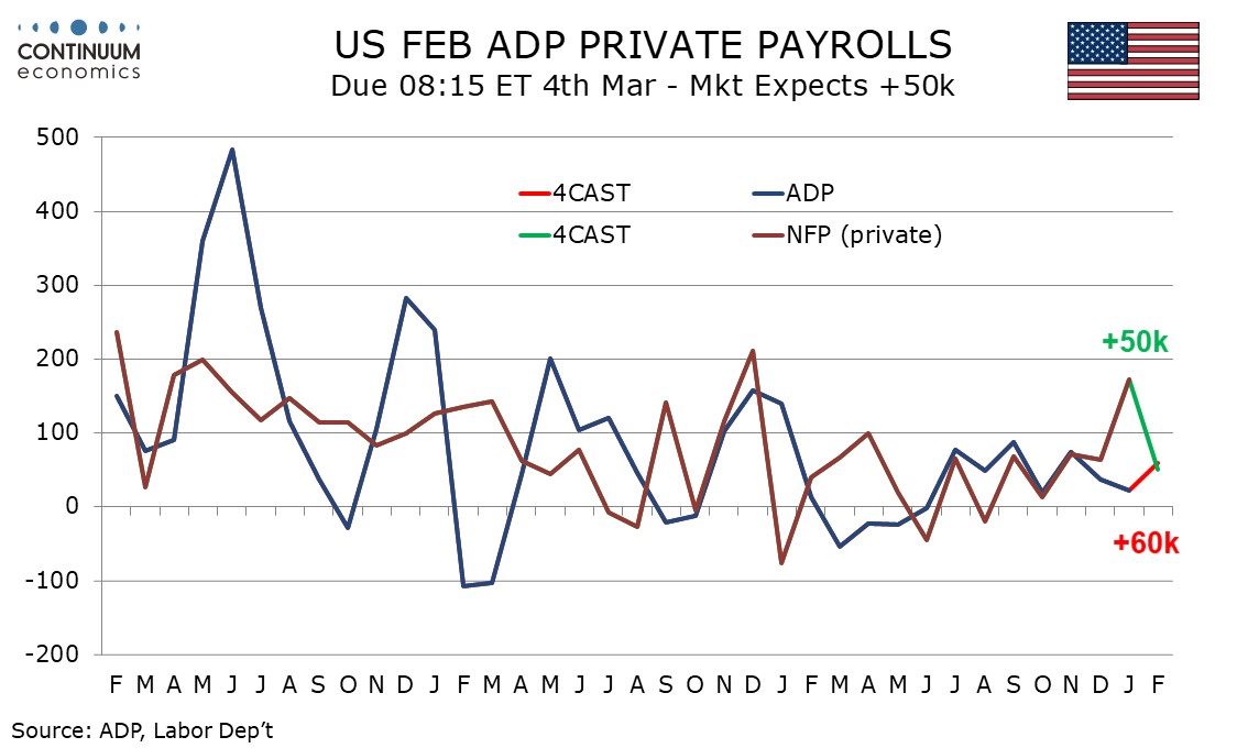 Weekly ADP data shows a 4-week average of 12.75k in the for weeks to February 7. The 4-week average may pick up in the week to February 14, given a fall in initial, claims in that week, the survey week for the monthly report. That would be consistent with a monthly ADP gain of 60k.