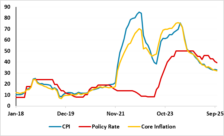 Figure 1: CPI, Core Inflation (YoY, % Change) and Policy Rate (%), January 2015 – October 2025