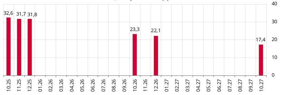 CBRT predicts end year-end inflation to stand at 24%, with an upper band of 29%. We also expect the slowdown in inflation to continue, but with a slower pace in Q4 as the inflation will stay over the CBRT’s upper band at the end of the year. We continue to envisage it will be (very) difficult to grind sticky inflation from 30%s to 10%s rapidly, taking into account that inflation becomes stickier requiring high interest to remain for some time, and CBRT will have to be cautious with the size of the rate cuts in 2026.