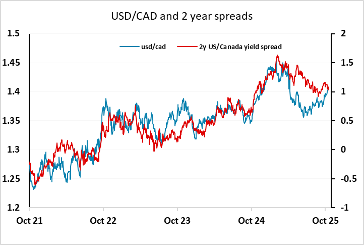Recent movements in front end yields have brought USD/CAD back in line with the historic yield spread correlation, also suggesting that the risks are now two-way, although the recent rise in USD/CAD means the technical momentum is on the upside.