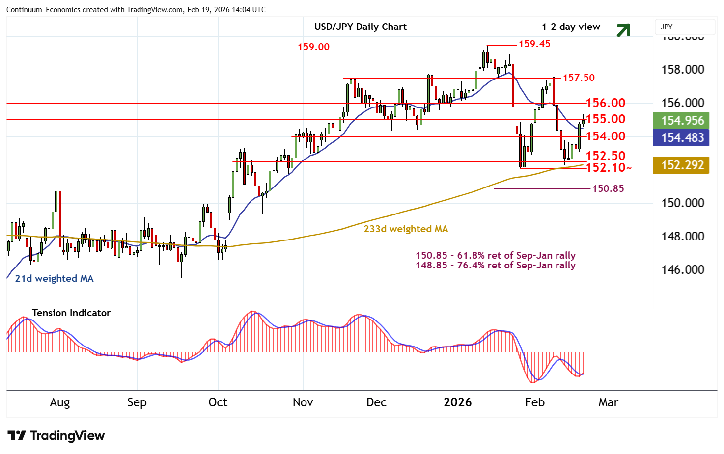 13:55 GMT - Anticipated tests higher have reached resistance at 155.00 in both USD- and JPY-driven trade, where unwinding overbought intraday studies are prompting short-term reactions. Daily stochastics and the daily Tension Indicator are improving, suggesting room for a test above here. But mixed/negative weekly charts should limit scope in renewed selling interest towards further congestion around 156.00. Meanwhile, support is raised to congestion around 154.00 and should underpin any immediate setbacks.