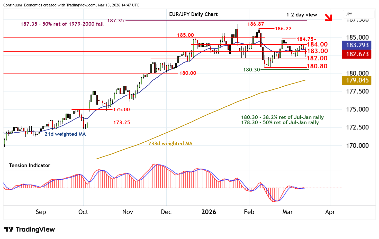 14:30 GMT - The anticipated break below 183.00 has reached 182.30, where rising intraday studies are prompting a minor bounce. Daily studies are under pressure and broadeer weekly charts are bearish, highlighting room for further losses in the coming sessions. Immediate support is at congestion around 182.00. But a close below the 180.80/00 range is needed to turn sentiment negative and confirm continuation of late-January losses. Meanwhile, any immediate tests back above resistance at 183.00 should be limited in renewed selling interest beneath congestion around 184.00.