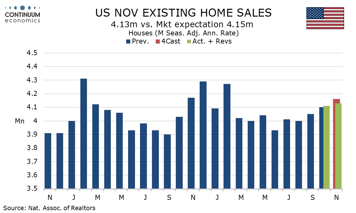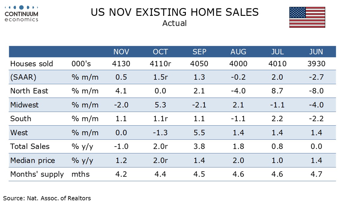 November existing home sales, up 0.5% to 4.13m, are a little short of expectations, but still delivered a third straight increase with October revised up to a 1.5% increase from 1.3%.