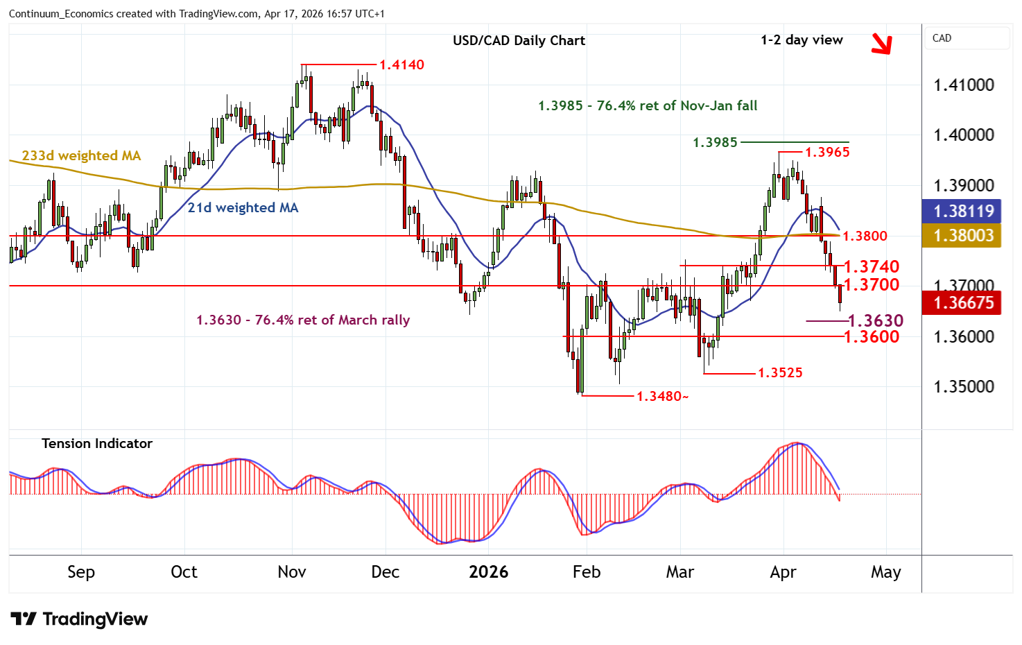 16:35 BST - Anticipated losses have reached congestion around 1.3650, where flattening oversold intraday studies are prompting short-term reactions. Daily readings continue to track lower, however, highlighting room for a further break towards the 1.3630 Fibonacci retracement. However, flat oversold daily stochastics could limit any initial tests of here in short-covering/consolidation, before deteriorating weekly charts prompt still further losses. Meanwhile, resistance is lowered to congestion around 1.3700. A close above here, if seen, would help to stabilise price action and prompt consolidation beneath the 1.3740 break level.