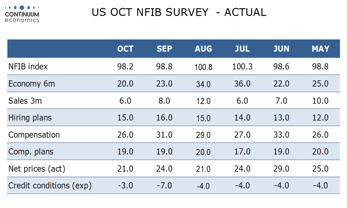 Compensation at 26 from 31 is the slowest since May. Compensation plans at 19 are unchanged while hurting at 15 has corrected marginally from September’s 8-month high of 16. Overall the NFIB survey is softer but far from weak.