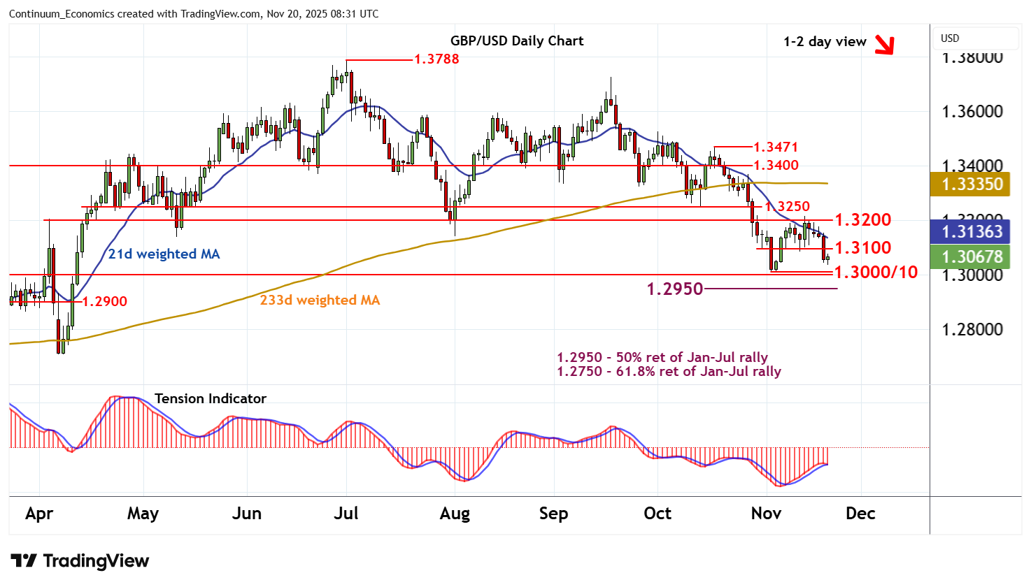 08:10 GMT - The anticipated break below 1.3100 has reached 1.3040~, where unwinding oversold intraday studies are prompting short-term reactions. A minor bounce is possible, but unwinding overbought daily stochastics and a tick lower in the daily Tension Indicator are expected to limit scope in renewed selling interest towards resistance at the 1.3100 break level. In the coming sessions, further losses are looked for, with support at congestion around 1.3000 and the 1.3010 weekly lows from early November to attract. However, negative weekly charts point to room for extension beneath here, and continuation of July losses towards the 1.2950 Fibonacci retracement. Meanwhile, a close above 1.3100, if seen, will help to stabilise price action and prompt consolidation beneath congestion resistance remains at 1.3200.