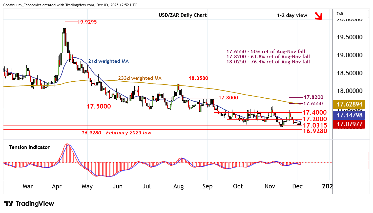 12:25 GMT - The anticipated test of critical support within 16.9280 - 17.0315 is giving way to consolidation, as intraday studies flatten, with prices currently balanced around 17.0830. Daily readings continue to track lower, highlighting room for a fresh test of here. But mixed/positive weekly charts are expected to limit any initial tests in consolidation, before bearish longer-term readings prompt further losses. A close below this range will turn sentiment negative and extend April losses towards the 16.6900~ year low of January 2023. Meanwhile, a close back above congestion resistance at 17.2000 would help to stabilise price action and prompt consolidation beneath congestion within 17.4000 - 17.5000.