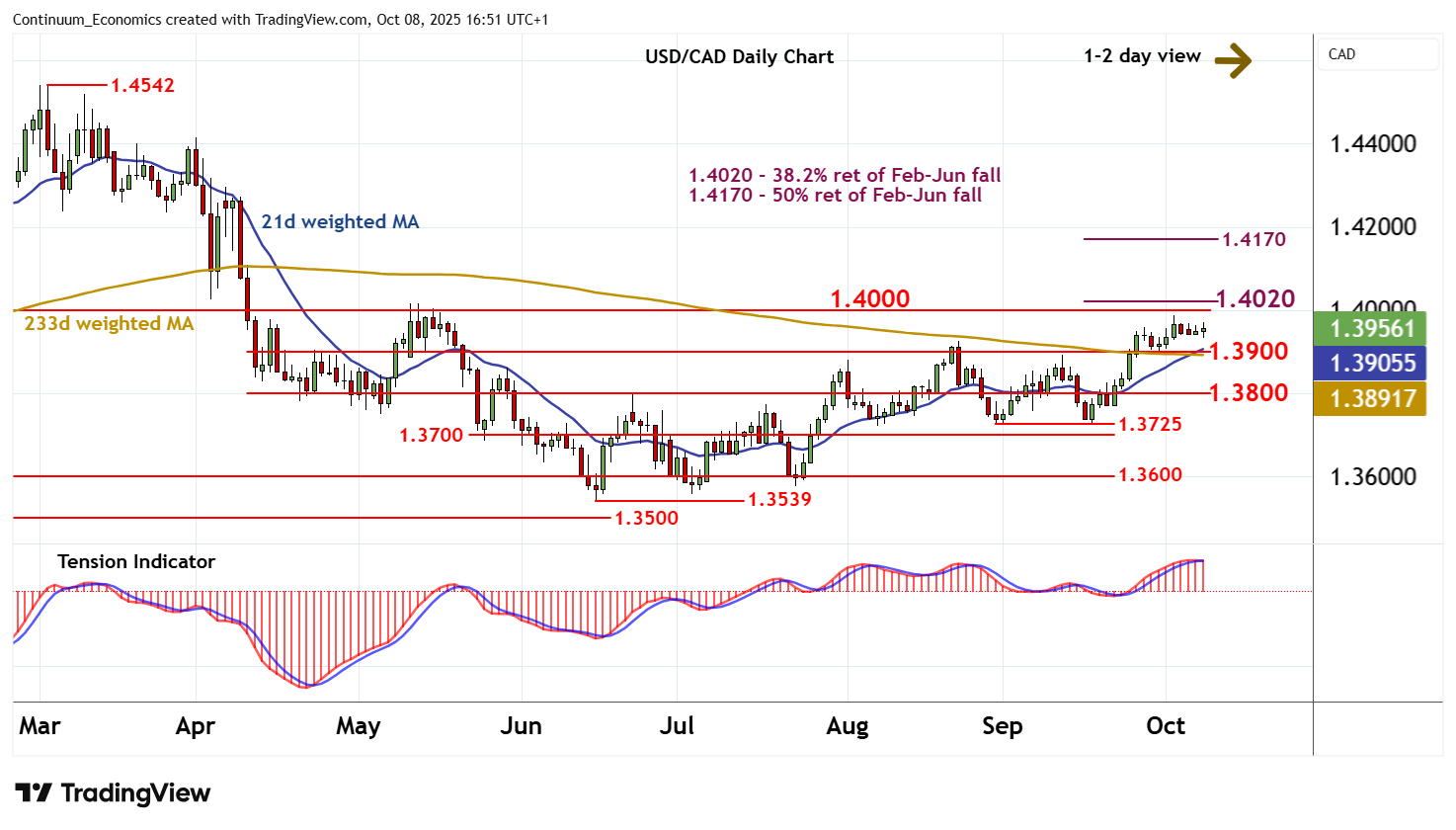 16:45 BST - Still little change, as mixed intraday studies keep near-term sentiment cautious and prompt consolidation above 1.3950. Daily readings are turning down, unwinding negative divergence, suggesting room for a move lower towards support at 1.3900. But rising weekly charts should limit any break beneath here in renewed buying interest above congestion around 1.3800. Meanwhile, resistance is strong at 1.4000 and the 1.4020 Fibonacci retracement. A close above here would turn sentiment positive and confirm continuation of June gains towards the 1.4170 retracement.
