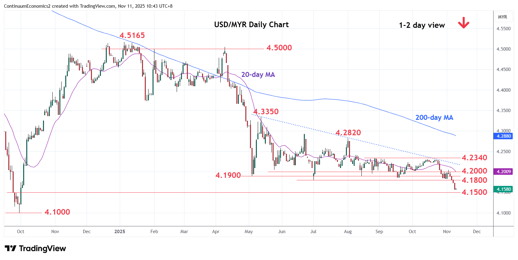 02:50 GMT - Break of the 4.1900/4.1800 May/July lows has seen losses to reach fresh year low at 4.1570. Consolidation here see prices unwinding oversold intraday studies but bearish momentum keep pressure on the downside. Nearby see support at the 4.1500 level. Below this, but not seen for now, will turn focus to the 4.1000, September 2024 year low. Stretched daily studies caution corrective bounce but strong resistance at the 4.1800/4.2000 recent lows are expected to cap corrective bounce.