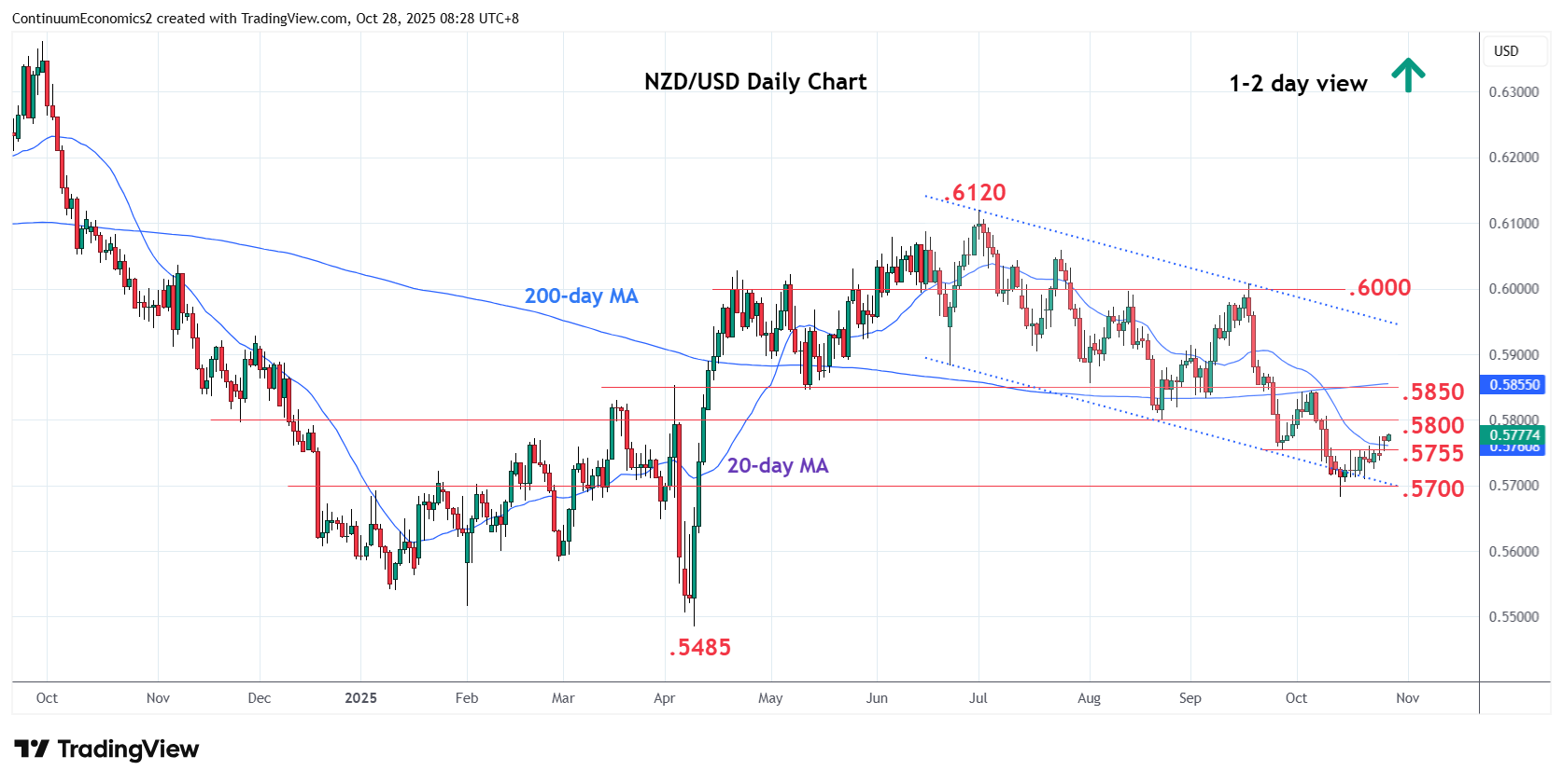 00:30 GMT - Break above the .5755 resistance see prices extending gains from the .5683 low of 14 October. Positive daily and weekly studies highlights scope for further gains ahead with focus now turning to strong resistance at the .5800 level and August low, which is expected to cap. Clearance, if seen, will open up room for stronger gains to retrace losses from .6000 level and channel resistance from .6120 July high and see room to the .5845/50 area. Meanwhile, support is raised to .5755 which is expected to underpin and sustain gains from the .5683 low.