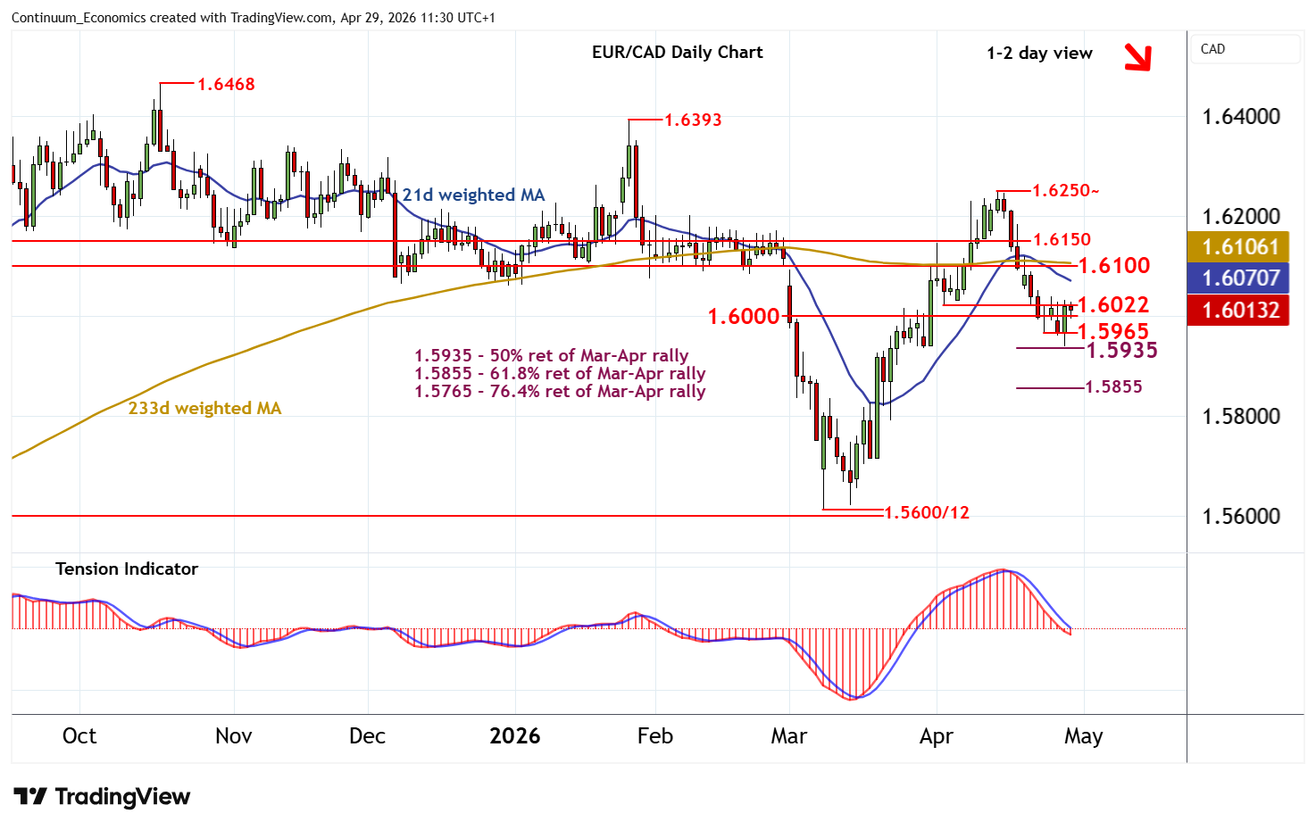 11:20 BST - Little change, as anticipated gains give way to cautious trade within the 1.6000 - 1.6022 range. Oversold daily stochastics are rising, suggesting potential for a test above resistance at the 1.6022 lows of 2-6 April. But the bearish daily Tension Indicator and mixed/negative weekly charts should limit scope in renewed selling interest beneath resistance at the 1.6100 break level. Meanwhile, support remains at the 1.5965 weekly low of 23 April and extends to the 1.5935 Fibonacci retracement. A close beneath here would turn sentiment negative and extend mid-April losses towards the 1.5855 retracement.