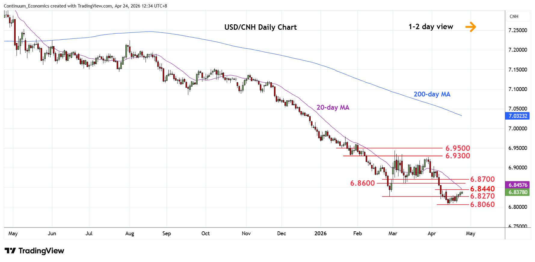 04:40 GMT - Edging higher as prices extend bounce from the 6.8060 low and consolidate recent losses from the 6.9300/6.9500 resistance. Higher see resistance at 6.8440, 13 April high. Clearance will see scope to strong resistance at the 6.8600/6.8700 area which is expected to cap. Corrective bounce is expected to give way to renewed selling pressure later to retest support at 6.8270 low of February then 6.8060 YTD low. Below these and the 6.8000 level will further retrace gains from the 2022 year low to support at 6.7750/6.7500 congestion area.