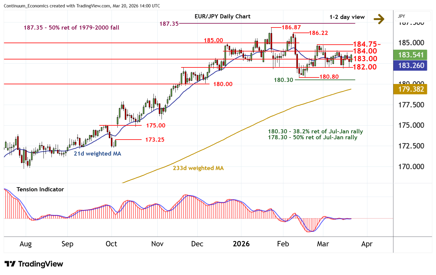 13:40 GMT - Choppy trade around 182.30 has given way to a steady EUR- and JPY-driven bounce, with the break back above 183.00 turning sentiment neutral and putting focus back on congestion resistance at 184.00. Daily readings have ticked higher, suggesting room for a test. But negative weekly charts should limit any break in renewed selling interest beneath the 184.75~ weekly high of 25 February. Meanwhile, support remains strong down to congestion around 182.00. But a close below critical support at 180.80/00 is needed to turn sentiment bearish and confirm continuation of late-January losses.