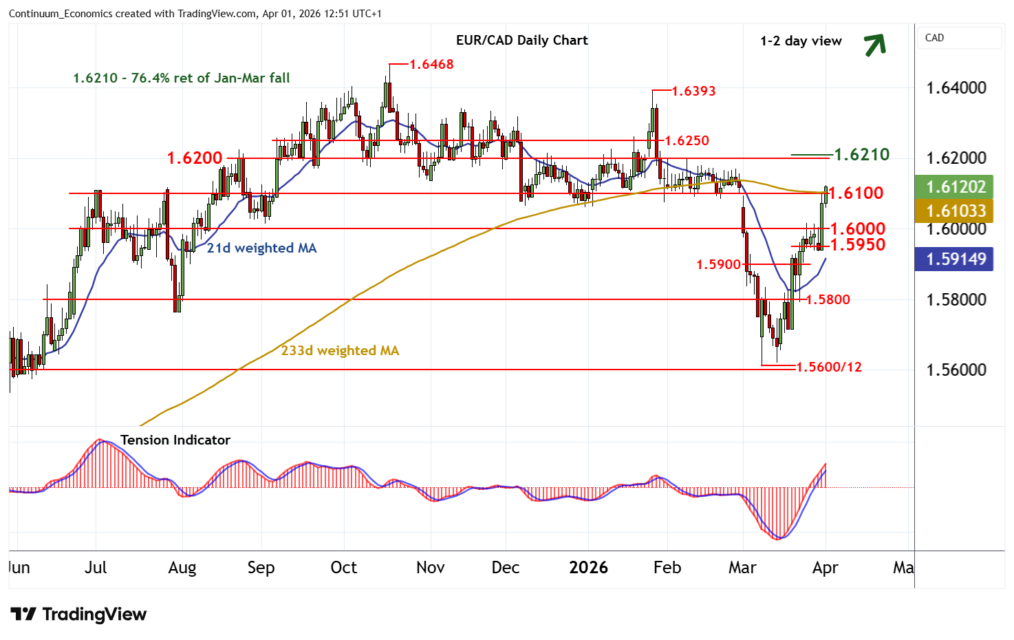 12:30 BST - Cautious trade around 1.6000 has given way to anticipated gains, with prices currently testing levels just above resistance at the 1.6100 break level. Daily stochastics are flat in overbought areas, suggesting potential for cautious trade around here, before the positive daily Tension Indicator and rising weekly charts extend gains still further. A close above 1.6100 will improve sentiment and extend March gains towards strong resistance at 1.6200/10. However, overbought daily stochastics could limit any initial tests in profit-taking/consolidation. Meanwhile, support is raised to congestion around 1.6000 and should remain intact in any immediate setbacks.