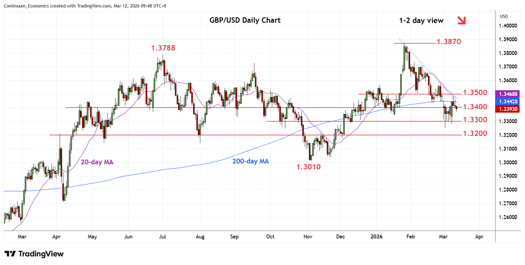 01:50 GMT - Settled back to consolidate at the 1.3400 level after bounce attempt failed to get a foothold above the 200-day MA. Rejection from the 1.3485 see successive lower highs from the 1.3870 January current year high weighing and threaten retest of support at the 1.3300 congestion and the 3 March YTD low at 1.3253. Below this will see deeper pullback to retrace the November/January rally to 1.3215, 76.4% Fibonacci level. Meanwhile, resistance at the 1.3450/1.3485 congestion and Tuesday's high now expected to cap and sustain bearish bias from January high.