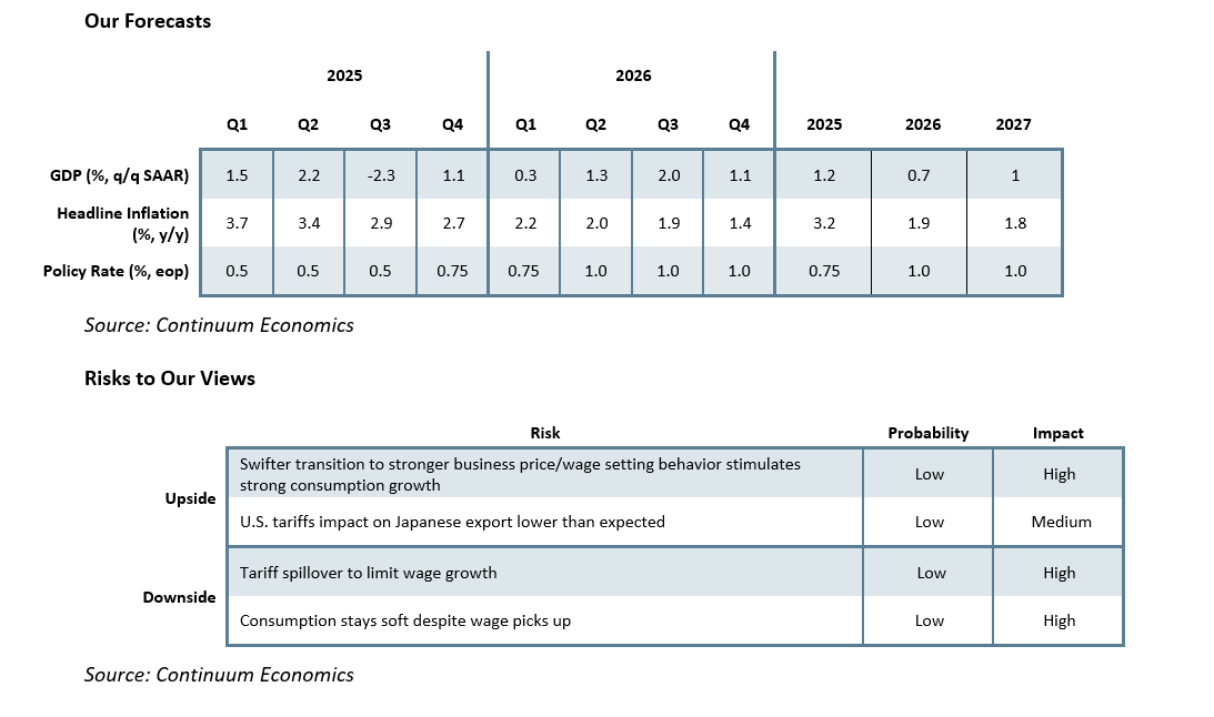 Our forecast for 2025 GDP is unchanged at +1.2% as the transition in business price/wage setting continues and consumer adapts to higher prices. We see 2026 GDP at +0.7% on balanced economic growth with competiting forces from adverse U.S. tariff and Japan stimulus boost. Private consumption is expected to grow at a modest pace, driven by improving real wage and adaptive consumer behavior. Headline labor cash earning has risen above 2% in September (2.1%) and October (2.6%) after a surprising dip in August. So far in 2025, the average labor cash earning is +2.3% y/y, a number that in BoJ’s eyes sufficient to drive inflation sustainably towards target rate. Early voices from unions are calling for 5% wage hike in 2026 and the market seems to be optimistic of the potential outcome.