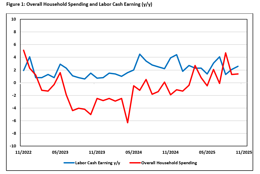 As per our September outlook, the choppy real wage situation has taken its toll in consumption growth. Fortunately, enough momentum has been built in the higher business price/wage setting behavior that allows the steady evolvement of consumer behavior. Real wage should improve in 2026 after the initial shock of U.S. trade tariff, along with optimistic early signs of the coming spring wage negotiation and thus support private consumption growth.