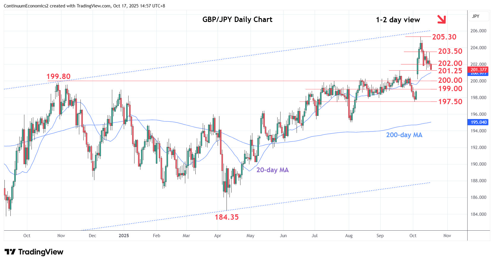 07:10 GMT - Consolidation above the 201.25 support has given way to break to extend losses from the 205.30, 8 October current year high. Negative daily and weekly studies keep pressure on the downside and see room for deeper pullback to retrace bounce from the 197.50 low to support at the 200.20/198.85 gap area. Filling this will see room for retest of the 198.00 congestion and 197.50 low of 2nd October. Meanwhile, resistance is lowered to the 202.00 congestion which is expected to cap and sustain losses from the 205.30 high.