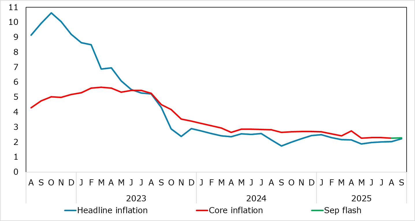 A second successive upside surprise is unlikely to make inflation any more of an issue for the ECB at present. Instead, moderate concerns whether the apparent resilience of the real economy may yet falter should remain the order of the day, this possibly a result of a still somewhat unresponsive transmission mechanism (effective borrowing rates have failed to match the drop in the ECB policy rate). This mindset will not be altered by the flash HICP data for September even given the further but largely as-expected 0.2 ppt rise in the headline to 2.2% (Figure 1), not least as this still implies that the ECB’s Q3 projection for both the overall and core figures in Q3 were met. This rise in the headline was again food and (largely) energy base effect driven but also with services, almost solely due to travel related base effects. But highlighting still soft core inflation, adjusted m/m data (Figure 2) still show reassuring signs while supply pressures still seem abated also offering signs that underlying inflation is no worse than in line with target, if not lower (Figure 3).