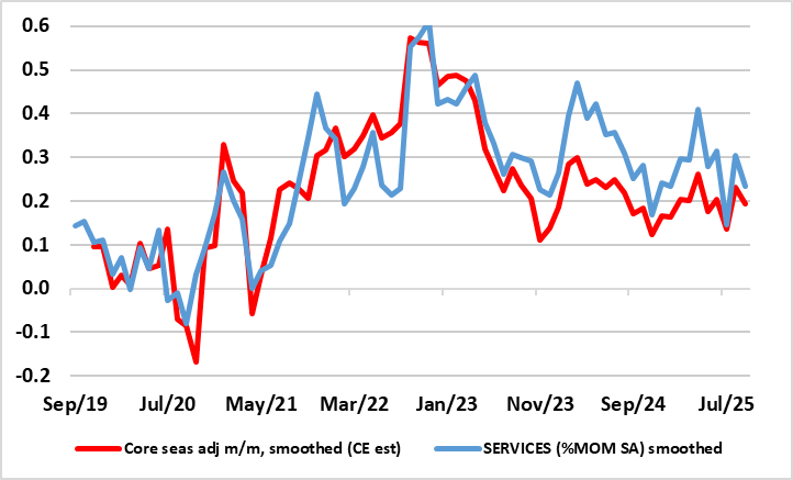 In contrast to food inflation in neighbouring economies, that for the EZ seems under control, actually slipping back despite some adverse weather of late. Admittedly, services inflation, at 3.2% in September, moved up a bare 0.1 ppt from what was the lowest since March 2022 but despite this rise, it not only matches ECB thinking for the last quarter but still seems to be belatedly following in the footsteps of lower wage pressures and where survey data for the sector also shows weaker price pressures. As a result, this trend and noise could bring the headline and core rate could both dip below 2% in Q4 with base effects pulling the headline down toward 1.7% in Q1, especially if demand weakness starts to accentuate what have largely been supply factors driving the disinflation process hitherto (see below). Notably, as recent calendar distortions unwind, what has looked like fresh price pressures in seasonally adjusted short-term m/m movements for core and services have reversed and are consistent with on-target inflation (Figure 2)!