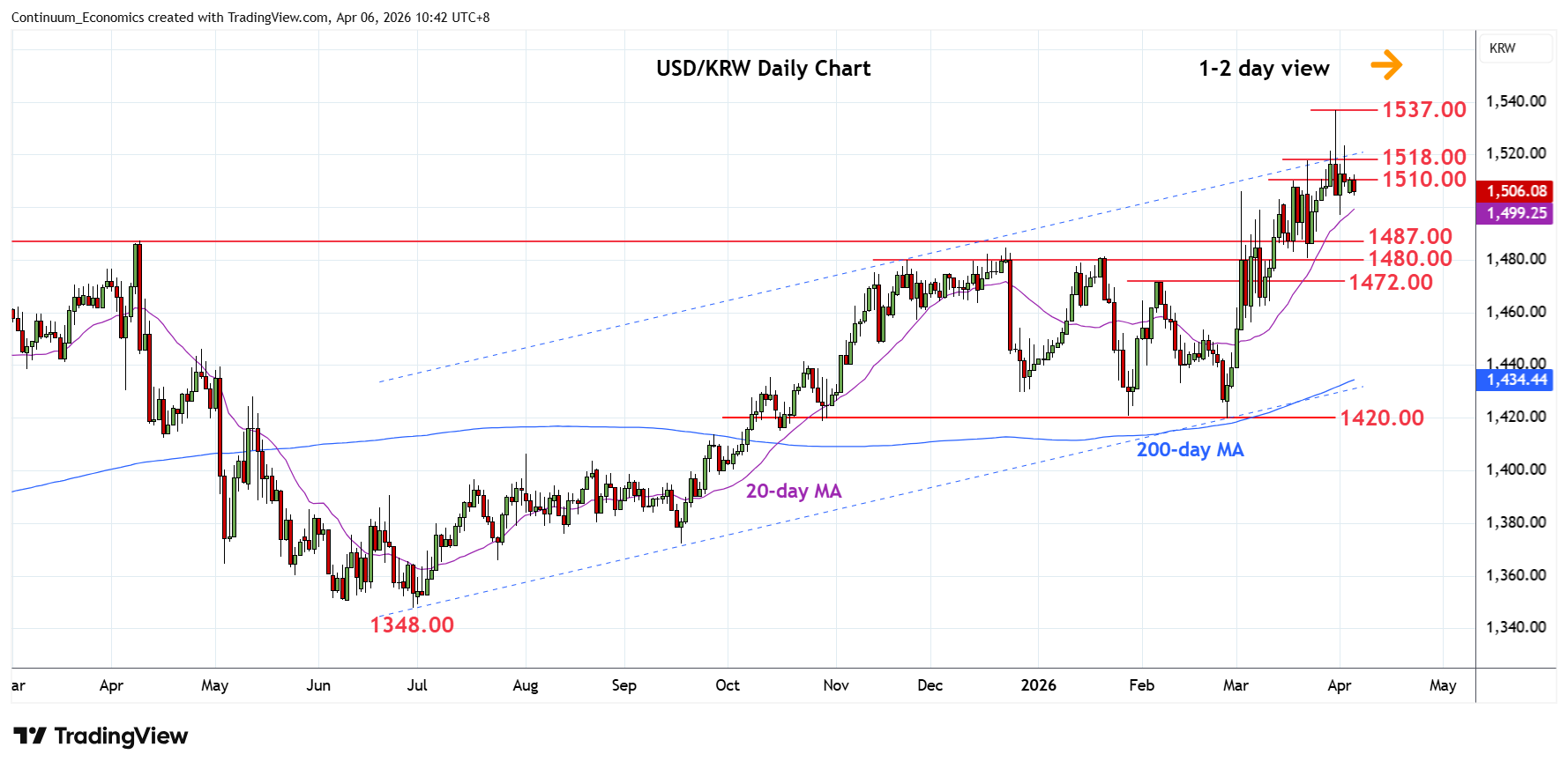 Chart USD/KRW Update: Back in consolidation below 1510.00/1518.00 resistance