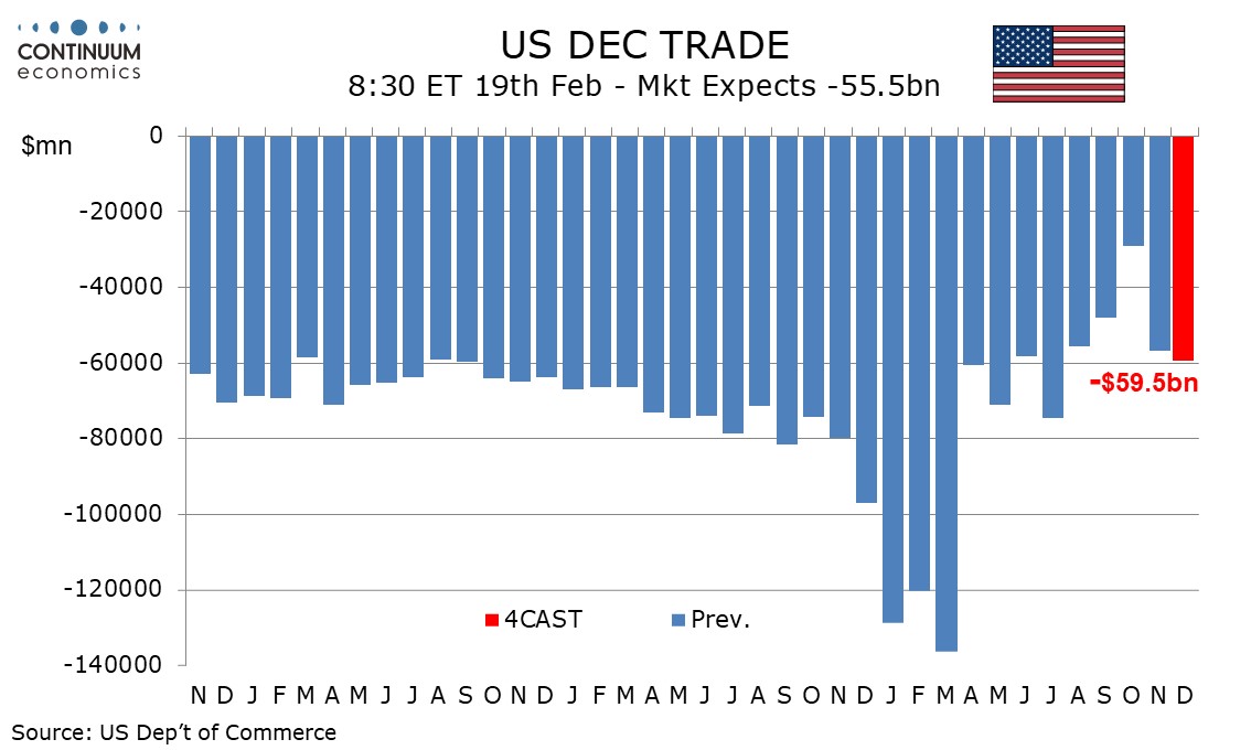 We expect a December trade deficit of $59.5bn, which would be the widest since August and up moderately from November’s $56.8bn. It would be up sharply from October’s $29.2bn which was the lowest since June 2009 but heavily influenced by temporary factors. The data may bring some fine tuning to expectations for Q4 GDP which is due on February 20.