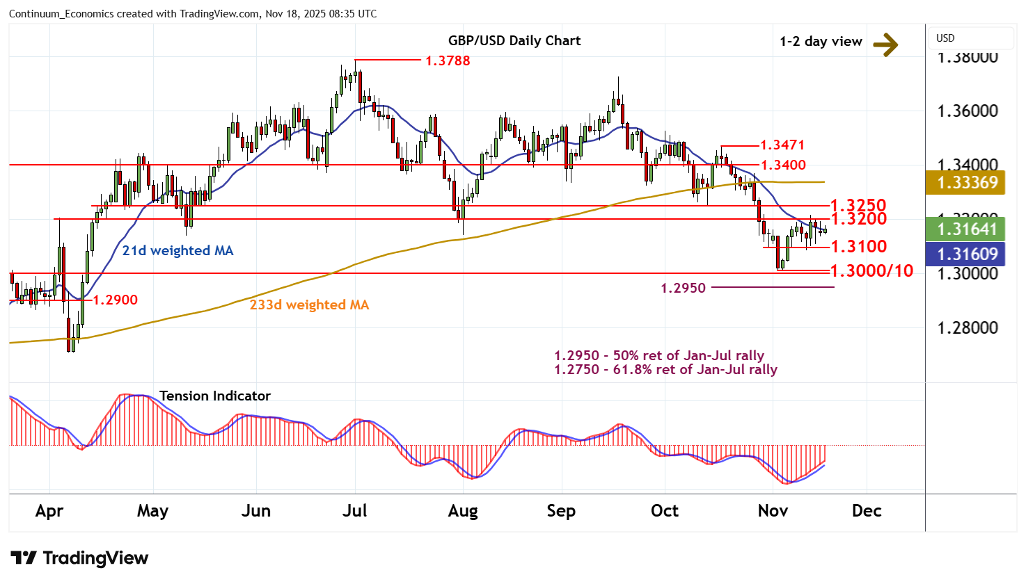 08:10 GMT - Still little change, as intraday studies turn mixed and prompt further choppy trade within the 1.3100 - 1.3200 range. The daily Tension Indicator continues to rise, highlighting potential for a move towards congestion resistance at 1.3200. But unwinding overbought daily stochastics and mixed weekly charts are expected to limit any initial tests in consolidation. A close above here, however, will improve sentiment and extend gains towards further congestion around 1.3250. Meanwhile, support remains down to the 1.3100 break level. A close beneath here will add weight to sentiment and open up stronger support at congestion around 1.3000 and the 1.3010 weekly lows of 4-5 November.