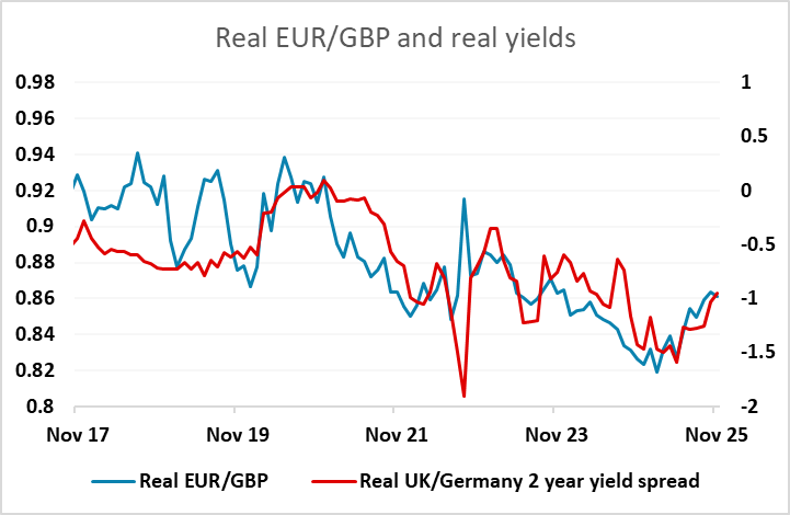 GBP has broadly returned to pre-Budget levels after a modest post-Budget rally. While the Budget itself did little to encourage GBP bulls, the forecasts underlying it suggested that the UK fiscal position is less immediately concerning than was previously thought. This seems to have taken away a little of the risk premium from both GBP and gilts. But we woul still expect a BoE rate cut in December and gradual convergence in real rates with the Eurozone in the coming years, so we still favour the EUR/GBP upside.