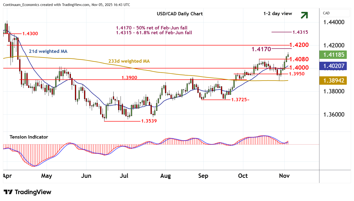 16:25 GMT - Anticipated USD- and CAD-driven gains have reached 1.4140, where unwinding overbought intraday studies are prompting short-term reactions. A minor pullback is highlighted, but rising daily charts and mixed/positive weekly readings are expected to prompt renewed buying interest towards support at the 1.4080 weekly high of 14 October. Following cautious/corrective trade, fresh gains are looked for, with June gains to focus on strong resistance at the 1.4170 Fibonacci retracement and congestion around 1.4200. However, already overbought weekly stochastics are expected to limit any initial tests in consolidation.