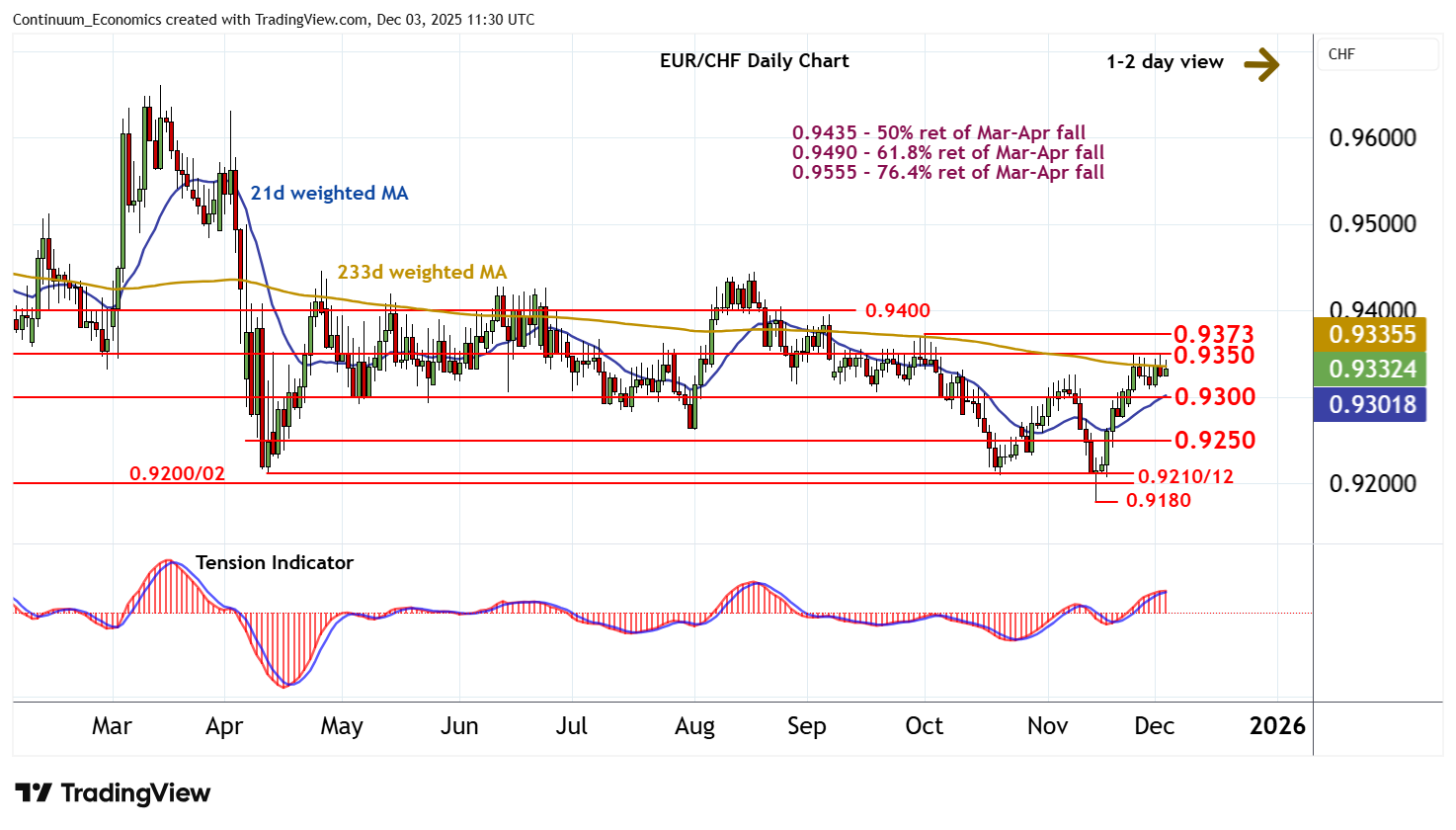 11:05 GMT - Little change, as mixed intraday and daily studies keep near-term sentiment cautious and extend consolidation beneath congestion resistance at 0.9350. Broader weekly charts are rising, suggesting room for a later break above here. But a further close above the 0.9373 monthly high of 1 October is needed to turn sentiment positive and confirm continuation of mid-November gains, initially to the 0.9400 break level. Meanwhile, support remains at congestion around 0.9300 and should underpin any immediate setbacks.